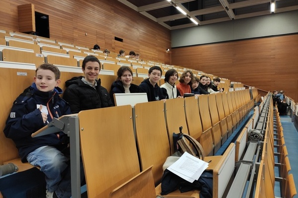 Am 09.10. konnten wir erneut mit einem Team am Tag der Mathematik in Heidelberg teilnehmen. Dabei konnten 5 Schülerinnen und Schüler der KS 1 zuerst einen Vortrag über euklidische und hyperbolische Geometrie hören, um sich dann in einem Teamwettbewerb mit 24 anderen Schulen der Region zu messen.